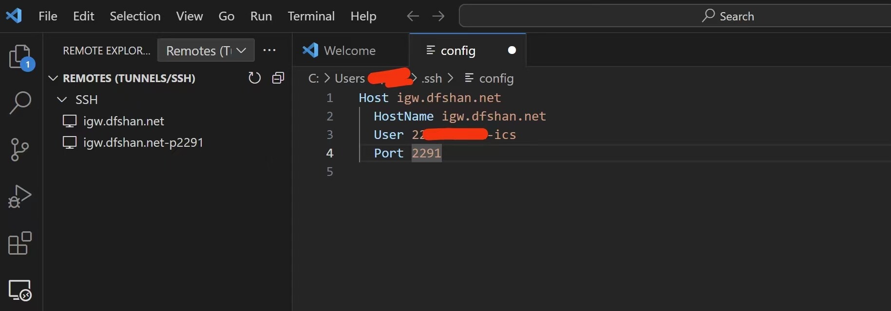 分别尝试了左侧 ssh 下的两个条目的文件夹按钮,得到的结果均是无法连接到 igw.dfshan.net(如图二)