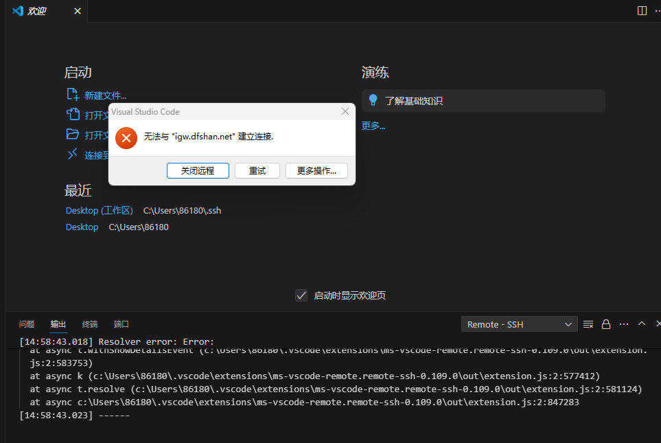 单击 igw.dfshan,net 右侧连接条目后,出现选择平台的选项,无论选择 linux 还是 windows 都出现了如下问题