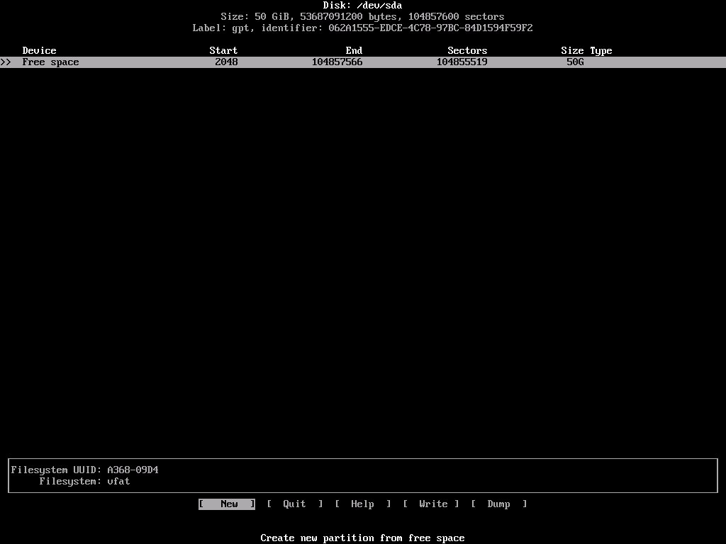 选择 New 并回车,输入 512M 并回车,出现第一个分区,路径为 /dev/sda1,容量为 512MB。选择 Type 并回车,选择EFI System 并回车,此时分区类型修改为 EFI 系统分区。将光标移动到Free space,选择 New 并回车,将剩余容量全部分给根分区,分区类型默认为 Linux 文件系统,此时界面为: