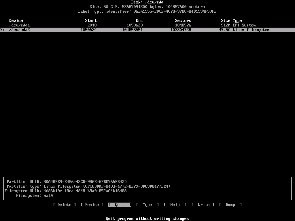 选择 Write 并回车,输入 yes 并回车保存分区表,选择 Quit 并回车退出。