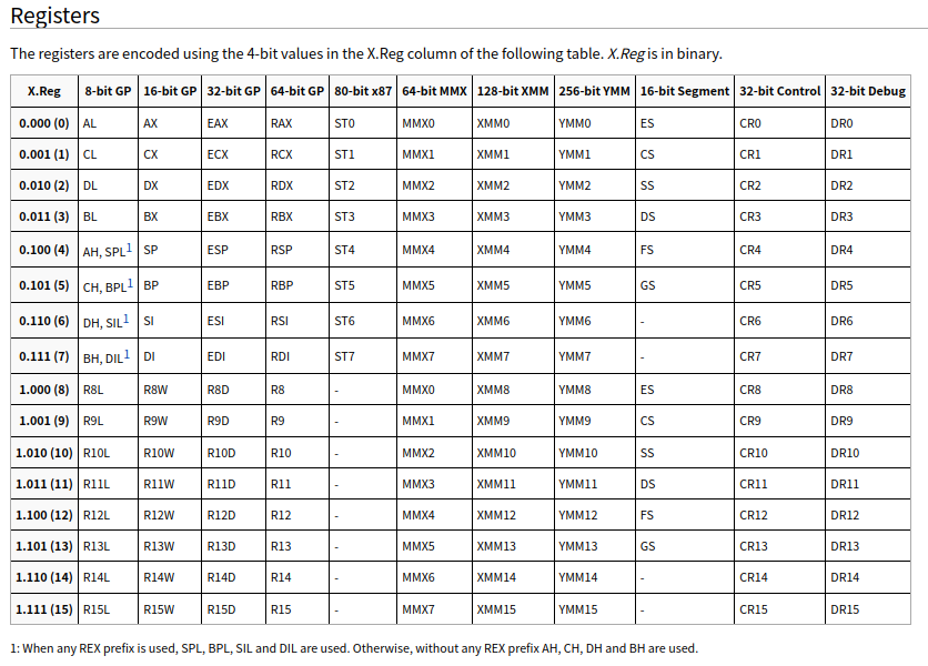 另外寄存器以 r 开头的是 x86-64(或 x64)架构,而不是 x86 架构,详情见下图
