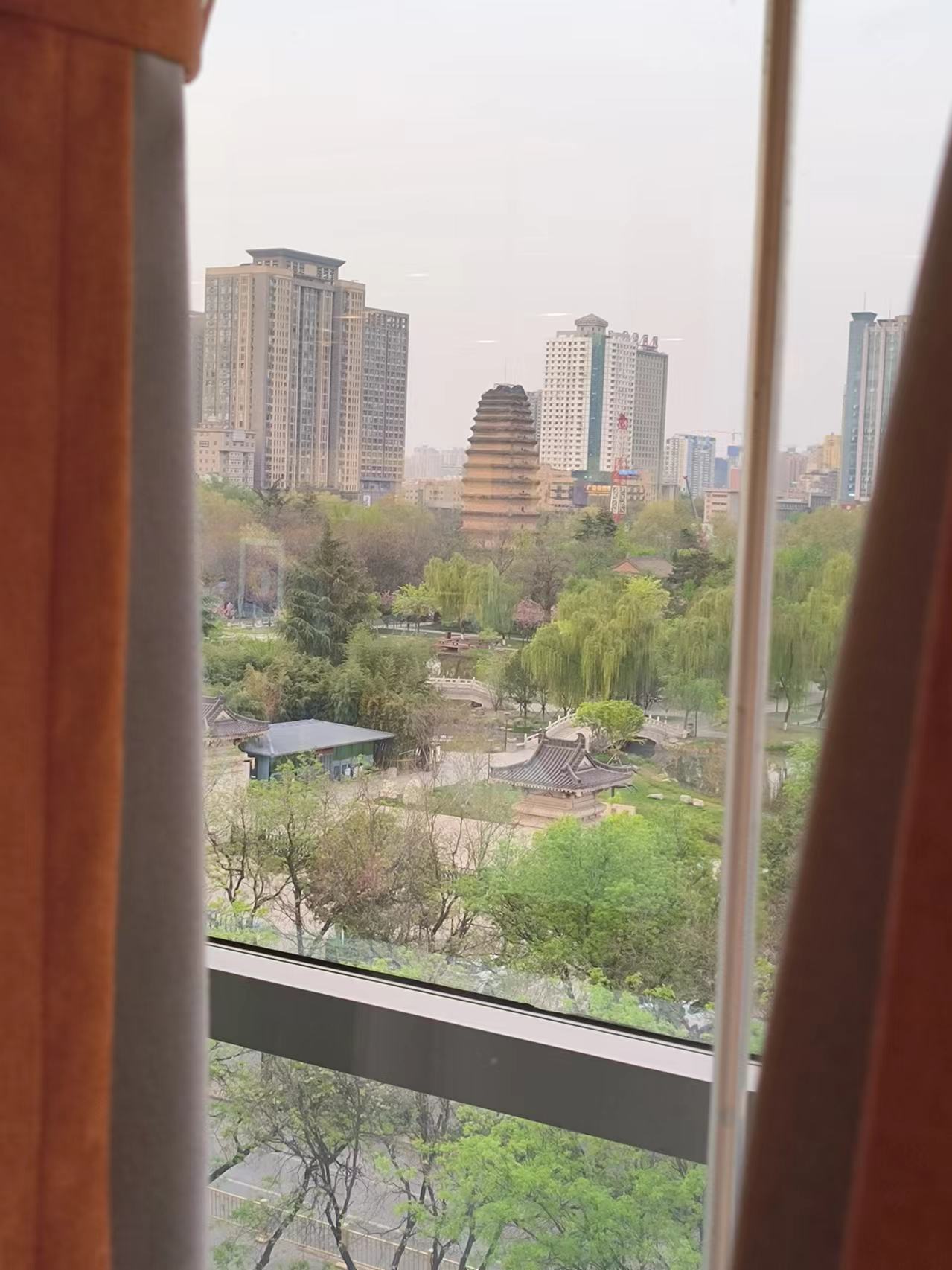 提供自助早中晚餐。菜品的质量和数量中规中矩,但对于 100 元左右的价格还是偏贵。在餐厅里可以清楚看到小雁塔。
