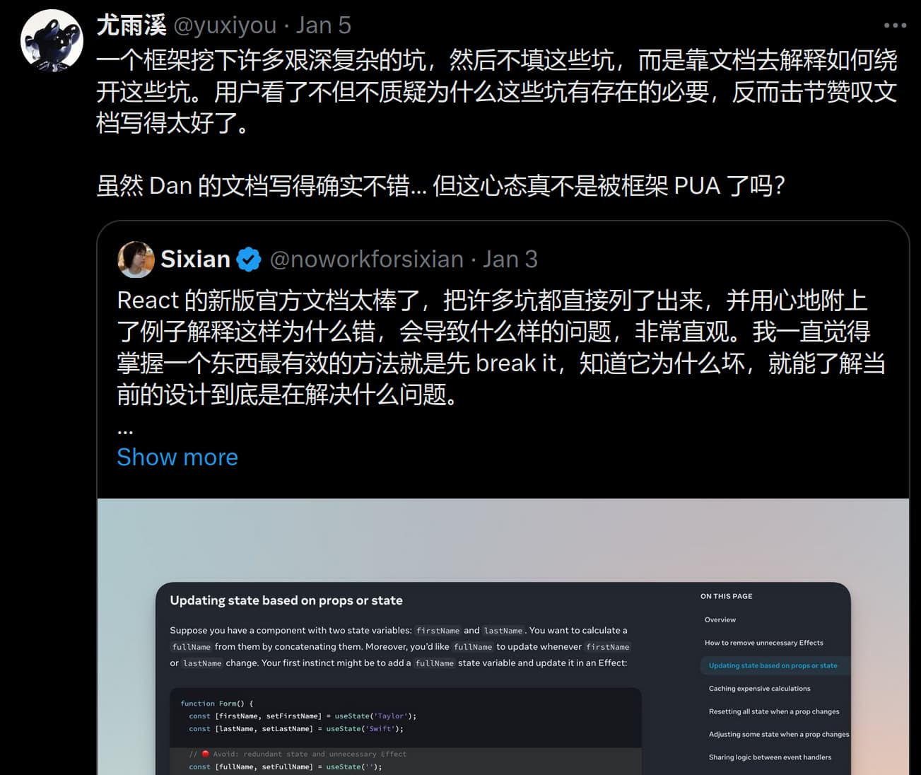 yyx 这波锐评“被框架 PUA”其实是毫无道理的,React 实际上是形成了一种设计模式,这个文档是对这种设计模式的解读,这种模式在 Vue 中也是无所不在的(所谓的 Composition API),喷这个框架艰深复杂,多少有点牵强了。