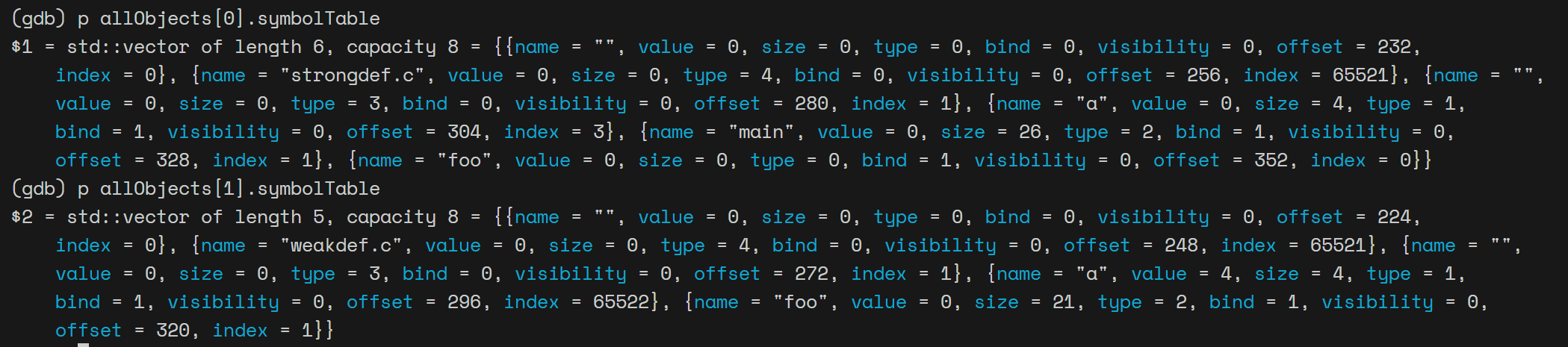 在调试 test4 时,void foo() 函数在 strongdef.c 中声明,weakdef.c 中定义,但 weakdef.c 对应的 relocTable 中找不到 foo 符号,因此 linker 返回“undefined reference for symbol foo”