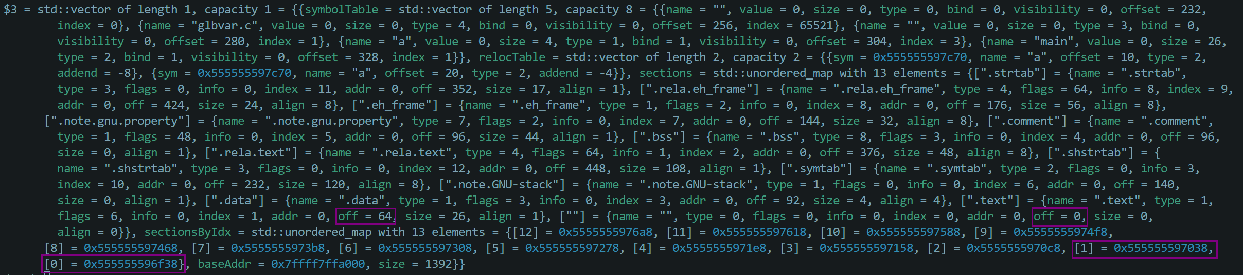 这里红框框出来的符号 a 的 index 是 3,value 是 0,offset 是 304。序号为 3 的节 off 是 92。