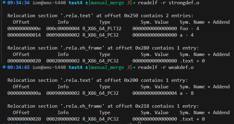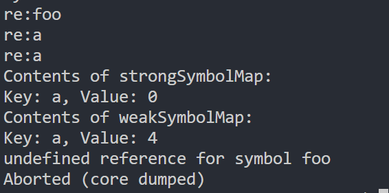 对于test4给出的测试,我运行并打印一些结果后发现在我的RelocEntry中只有一个foo(正常情况一个是一个强符号 foo 和一个 undef 的 foo),且其符号类型是 undef(既没有加入到强符号 map,也没有加入到弱符号 map),为什么我的强符号 foo 不见了,始终报undefined reference for symbol foo的错误。
