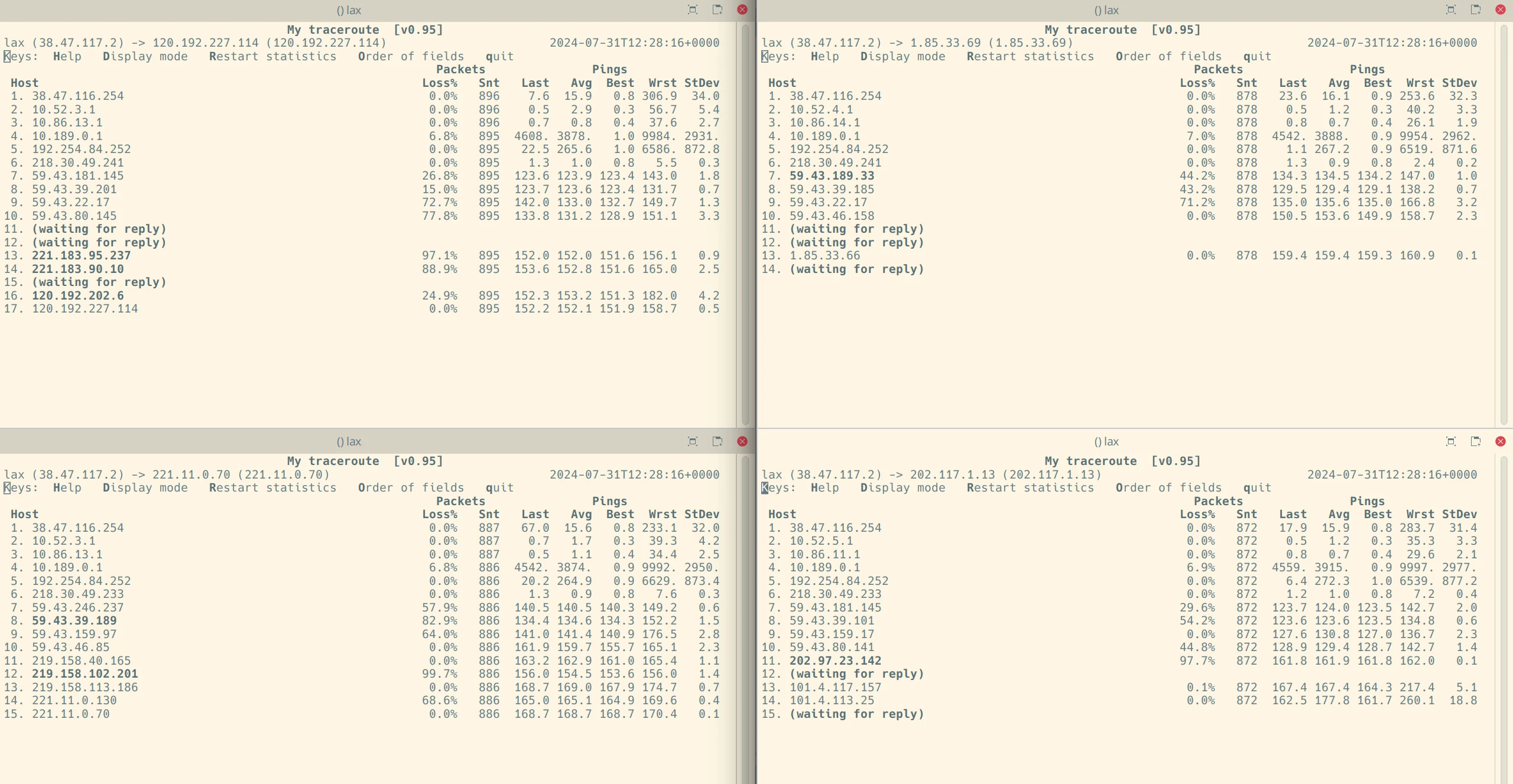 开始顺时针:仪冻、殿信、交大赛尔、炼铜)的丢包率和延迟