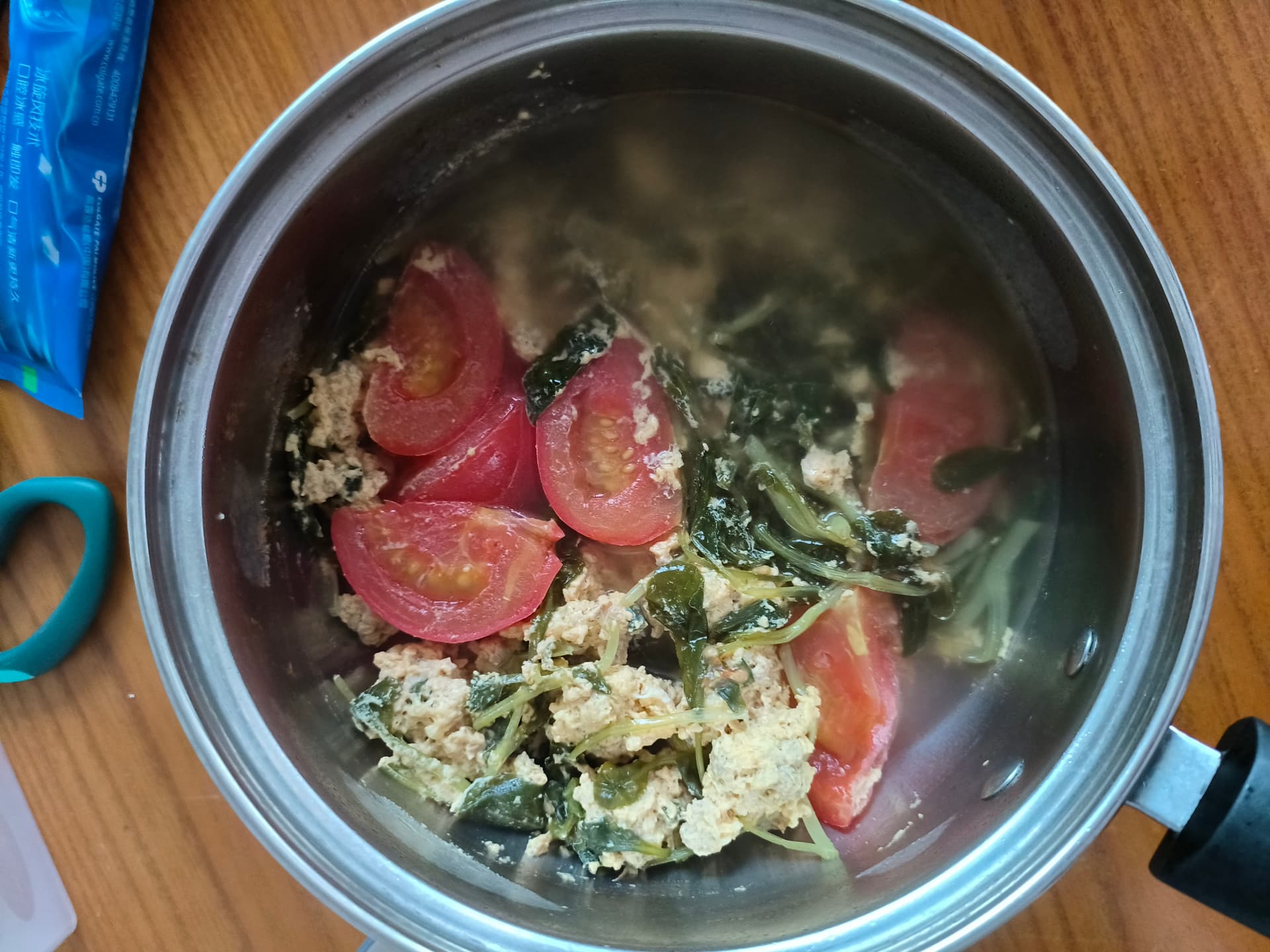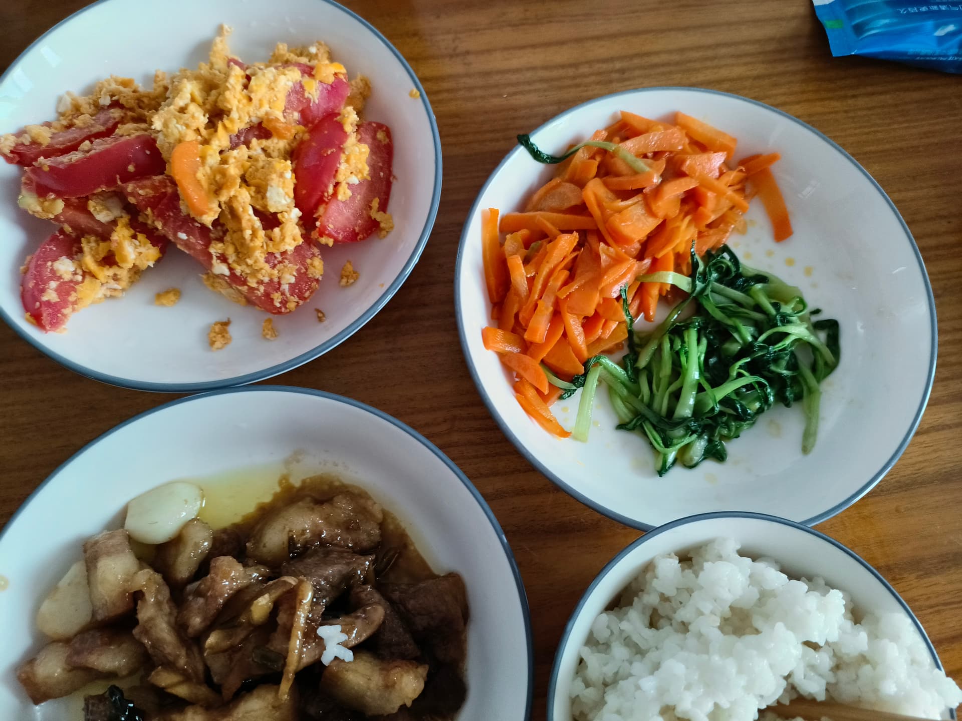 前几天吃太杂了得了肠胃炎,连续两天吃钠含量超高的陈克明面条之后,今日电饭锅和米都俱全,首次吃到了饭。由于上班没时间做菜,草草炒了一个西红柿