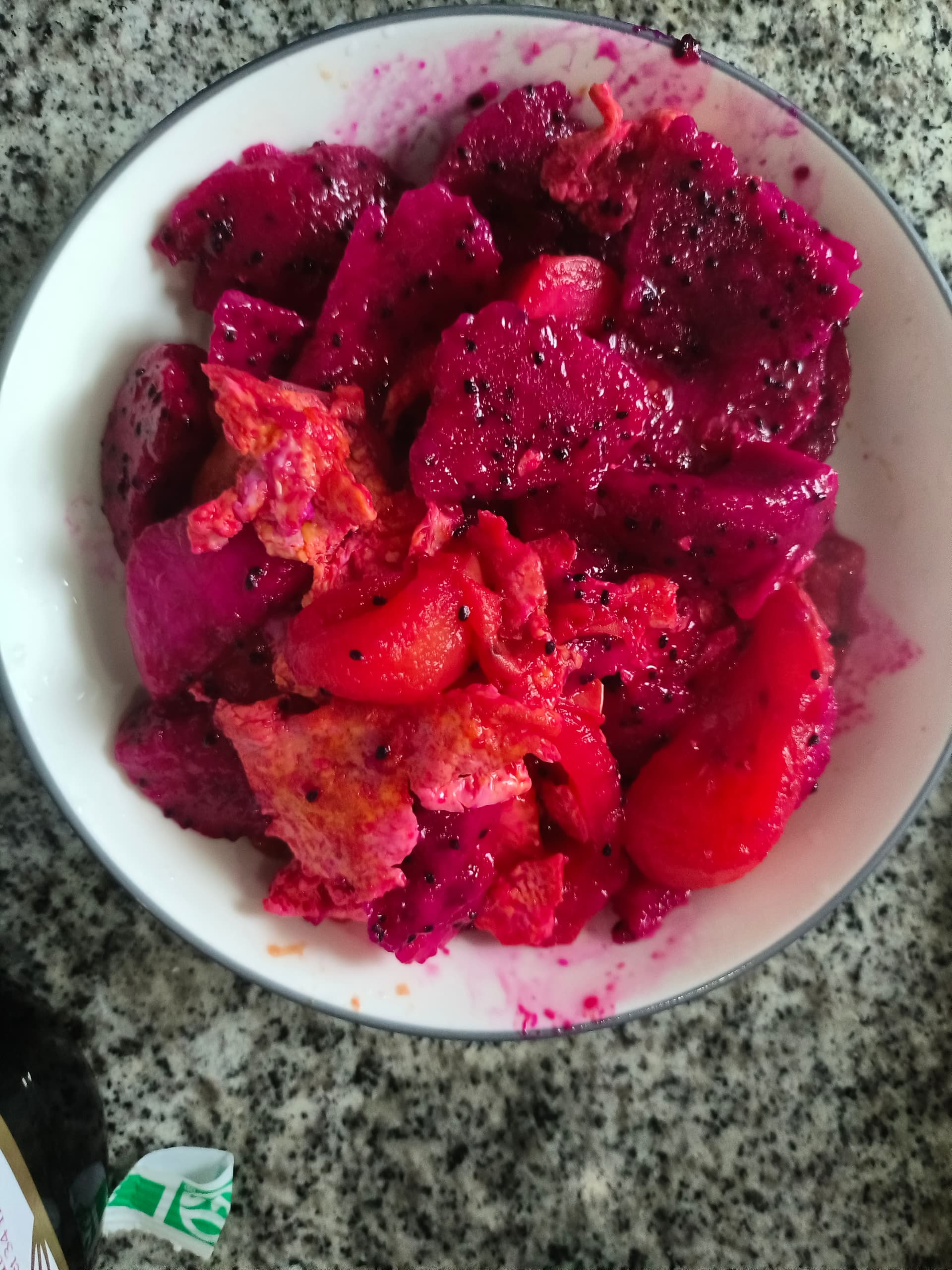 炒鸡蛋,由于怕前几天买的火龙果放冰箱久了坏了,又不敢吃生冷食物,遂放进来一道炒。一碗饭两碟菜,自己做的,感觉比食堂吃一大堆东西要舒服。(hindsight:(红心)火龙果跟甜瓜/香瓜一样,性寒,肠胃不适时服用会加重症状)