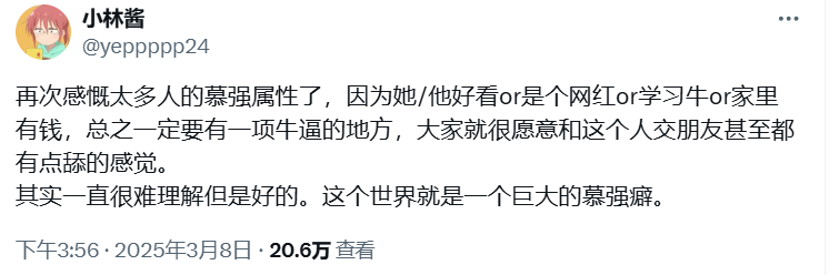 不叫慕强吧,愿意去交友肯定是因为看到了至少一项优点,对你有吸引力。还有就是不能有特别突出(到 annoying 程度)的缺点