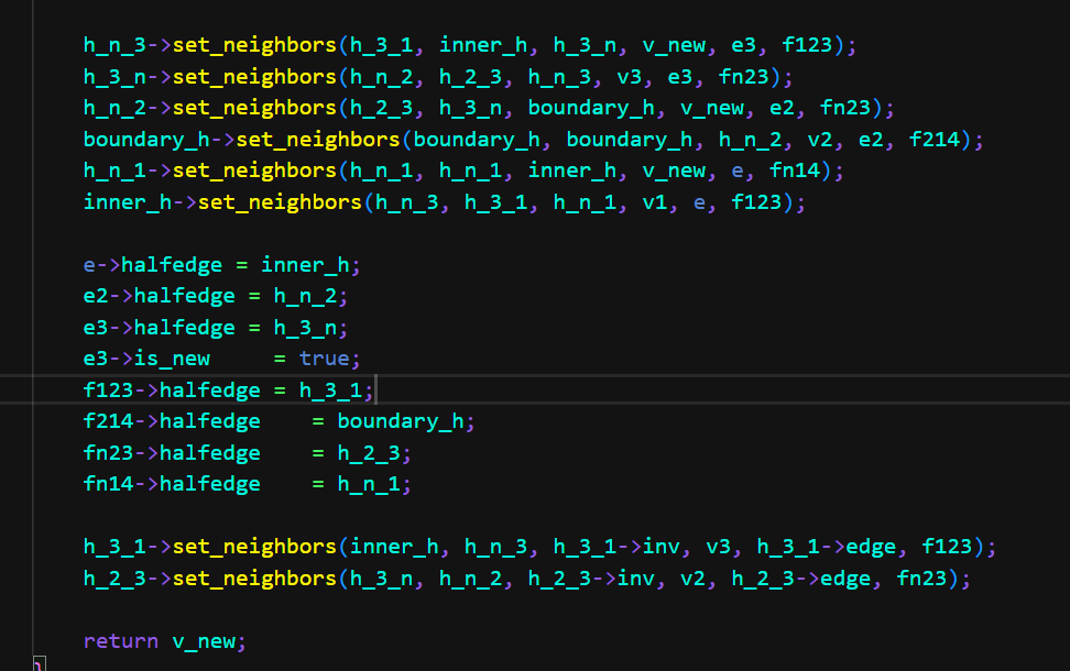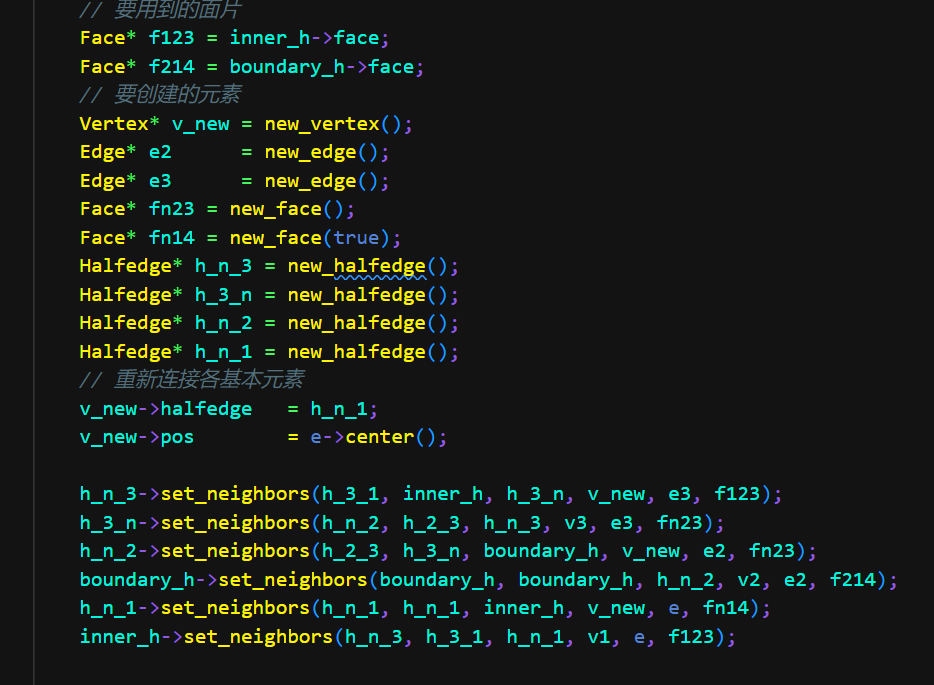 还有对边界边作分裂时,我始终得不到正确的结果,是不是我对属于一个“虚假的”面的半边的处理不对,文档中没太说清楚 prev、next 等是怎么做的?我仔细检查各个量的邻接关系没有找到错误。