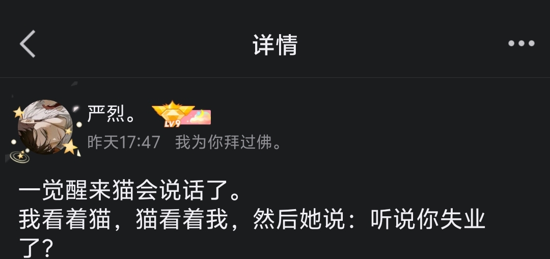 猫一下震撼了,好像刚认清她会被牵连的这个事实一样,瞬间改口:那你振作一下快去找工作吧。