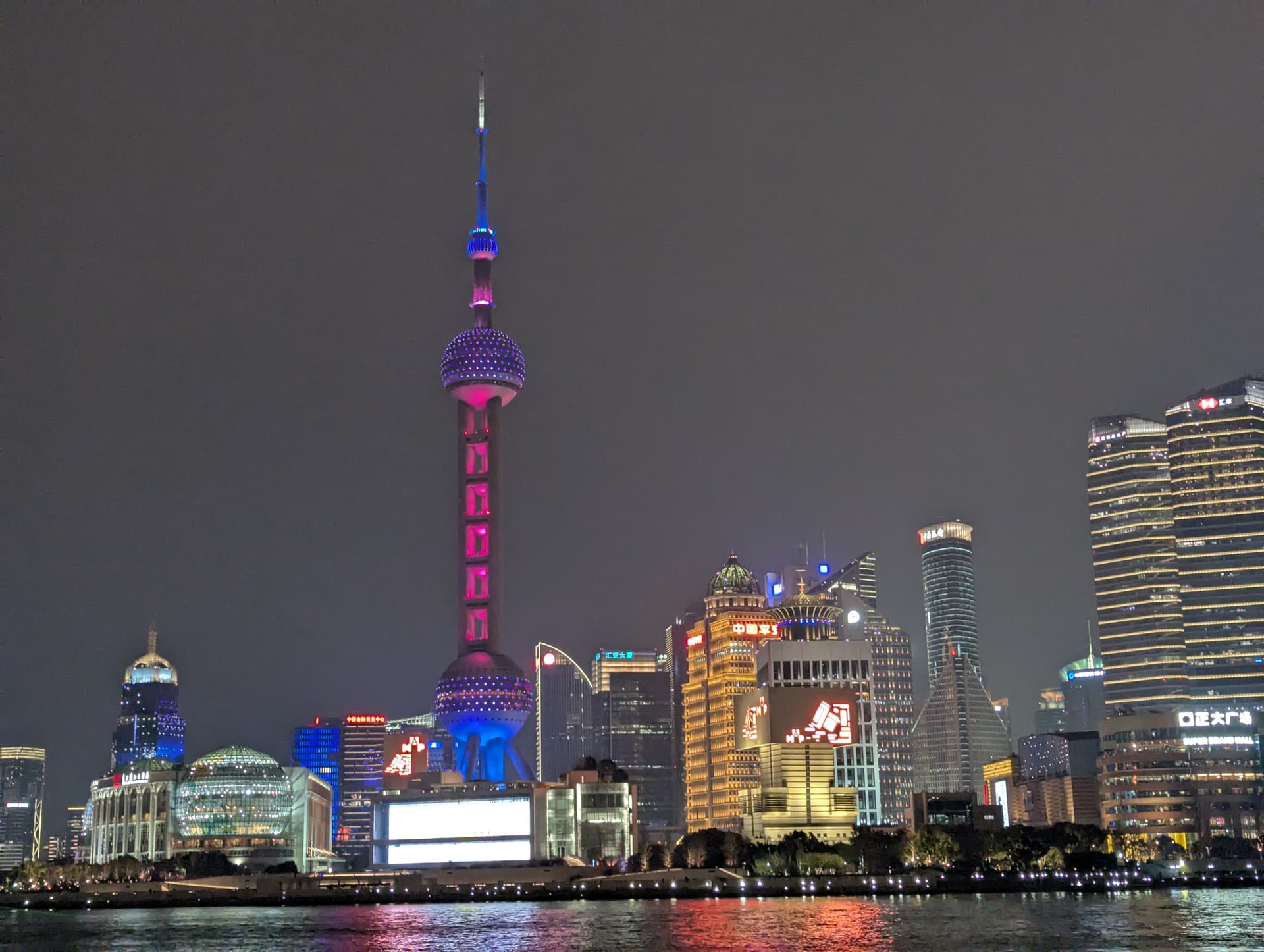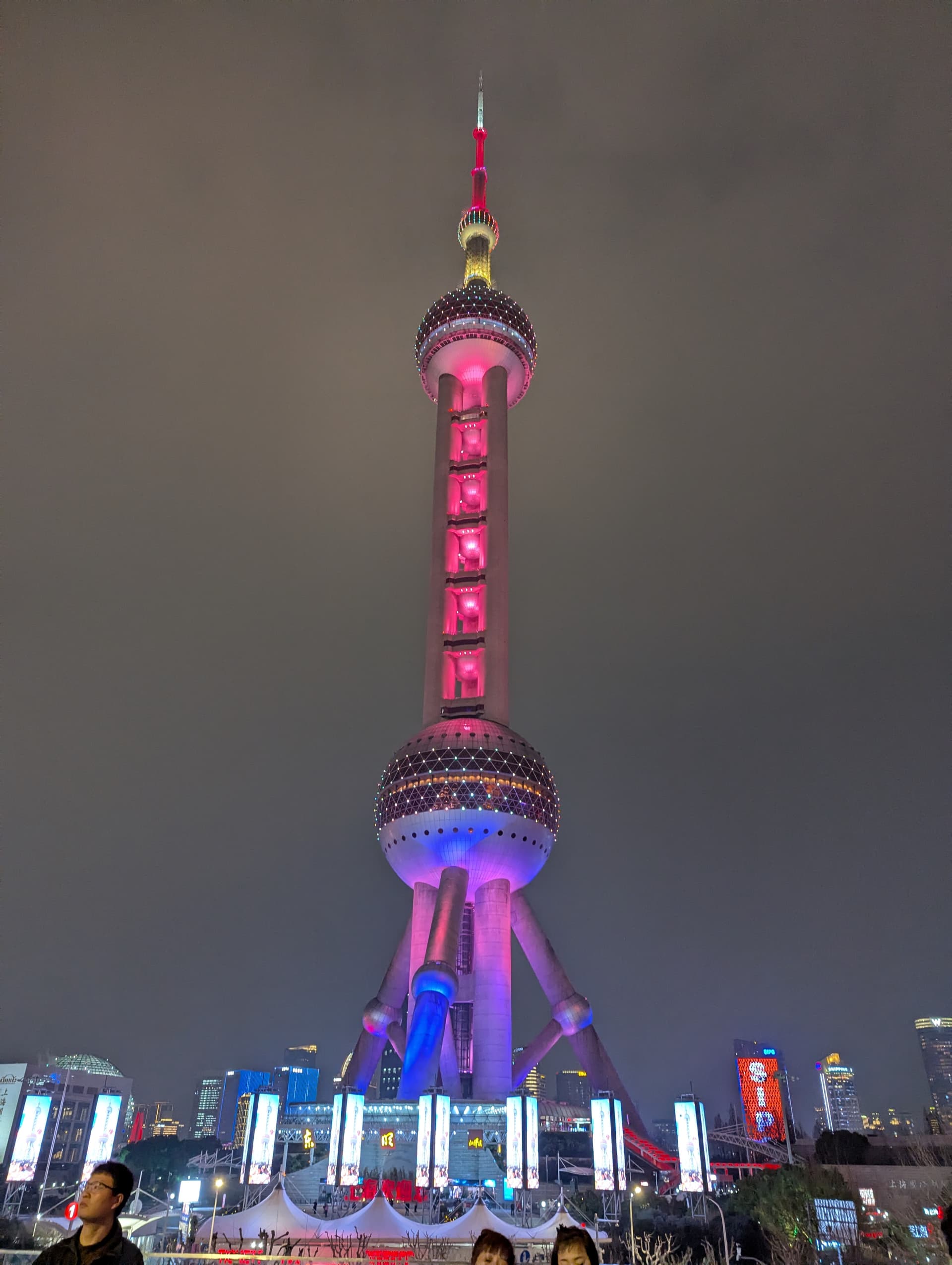 Oriental Pearl Tower 夜晚穿了一身动态的彩色的裙子,确实挺好看。上顶上有点贵,299,相当于我一晚上的房费,就没去