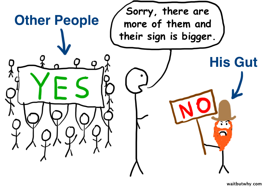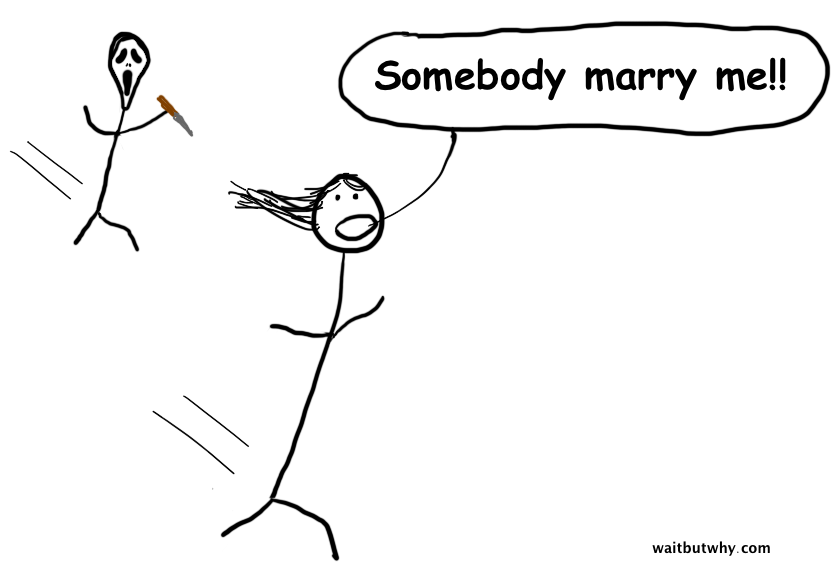 在我们的世界里,主要的规则是在“太老”之前结婚——“太老”的定义因地区而异,通常是 25 到 35 岁之间。正确规则应该是“无论如何,不要嫁给错的人”,但社会对一个 37 岁的单身人士的批评远远超过对一个带着两个孩子的 37 岁不幸福已婚人士的批评。这毫无道理——前者离幸福婚姻只差一步,而后者要么忍受永久的不幸,要么经历一场混乱的离婚,才能赶上单身人士的处境。