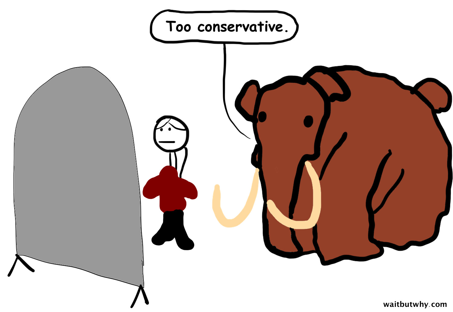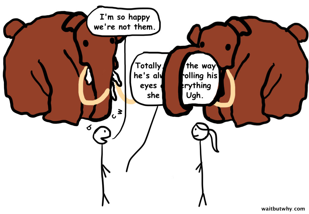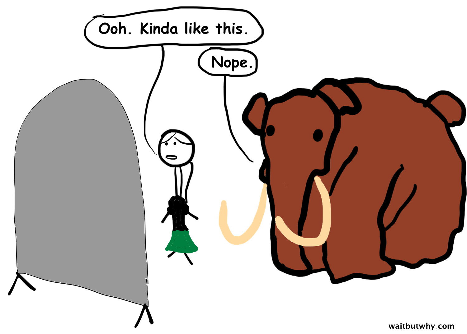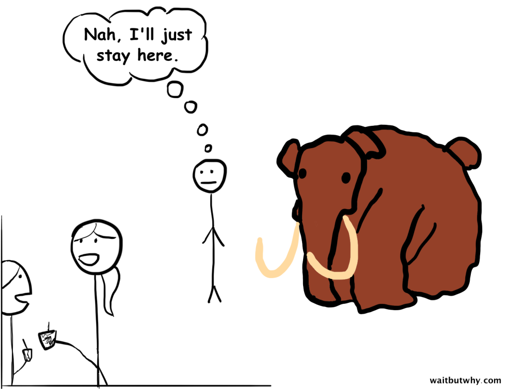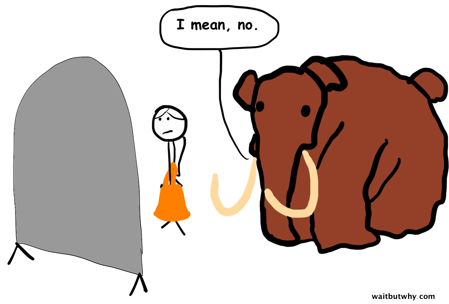 我们的身体和大脑是为了生活在公元前 50,000 年的部落中而构建的,这让现代人类具有许多不幸的特征,其中之一是对部落式社会生存的执着,而在现代社会中,社会生存已不再是一个真实的概念。我们现在都在 2014 年,伴随着一只庞大、饥饿且容易恐慌的毛茸茸猛犸象,它仍然认为现在是公元前 50,000 年。