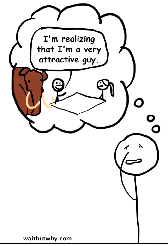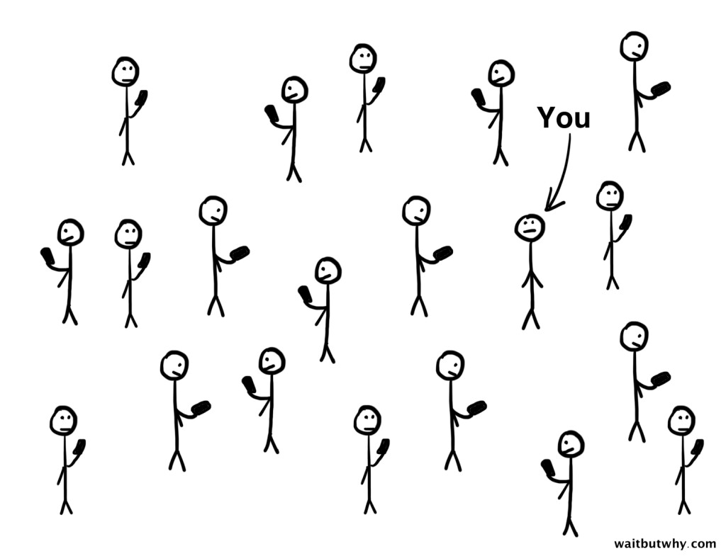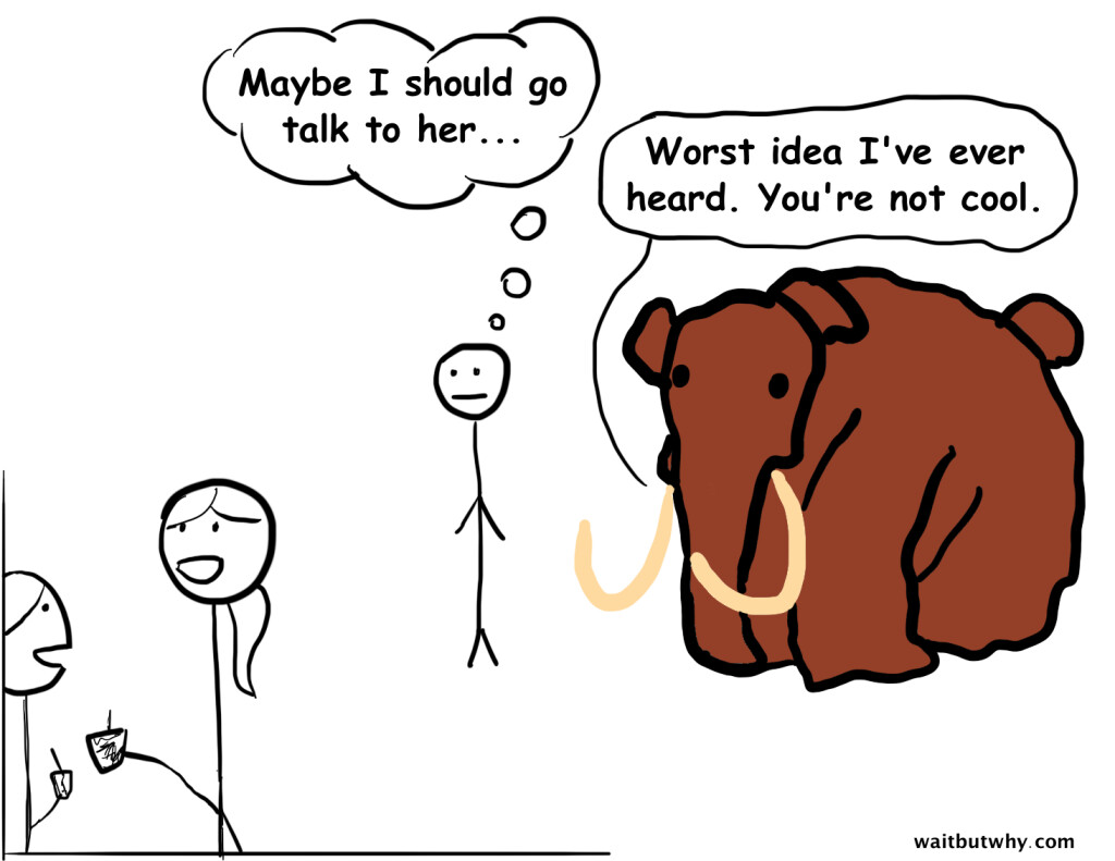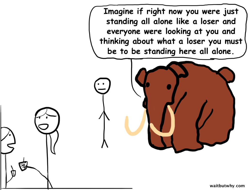 当时,成为部落的一部分对生存至关重要。部落意味着食物和保护,在那个食物和保护都不容易获得的时代。所以对于你的第 2000 代祖父来说,几乎没有什么比被他的部落成员接受更重要的了,特别是那些处于权威地位的人。与周围的人合群并取悦上级意味着他可以留在部落里,而他能想象到的最糟糕的噩梦就是部落里的人开始议论他是多么烦人、无用或怪异——因为如果有足够多的人对他不满,他在部落中的地位就会下降,如果情况变得更糟,他会被完全驱逐并被置于死地。他也知道,如果他曾经因追求部落里的女孩而被拒绝,她会告诉其他女孩这件事——不仅他失去了这个女孩的机会,而且可能永远找不到伴侣,因为他生命中所有的女孩都会知道他那愚蠢失败的尝试。被社会接受是一切。