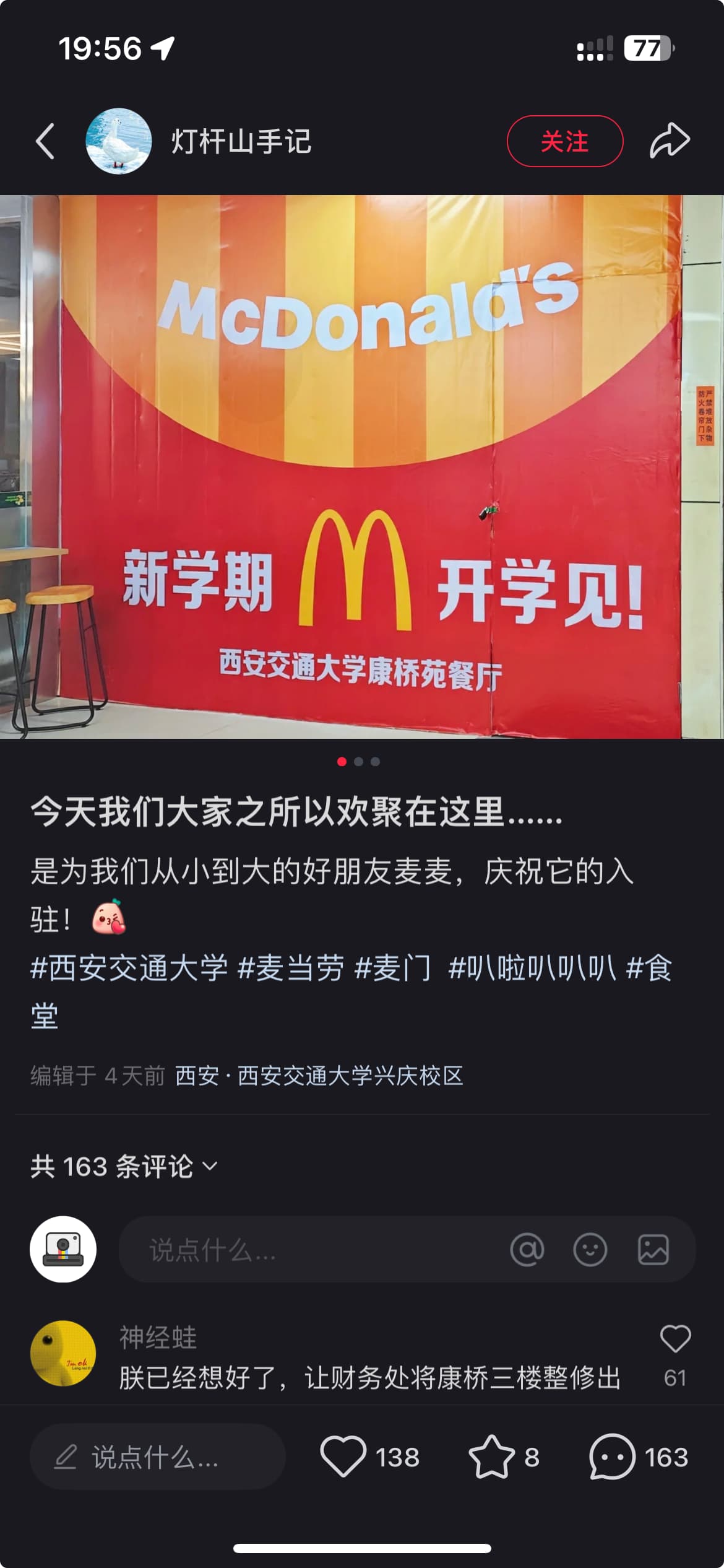 I don’t know why when I click in it always shows my reading progress here, but just now on Xiaohongshu I saw that Xi’an Jiaotong University will have a McDonald’s.