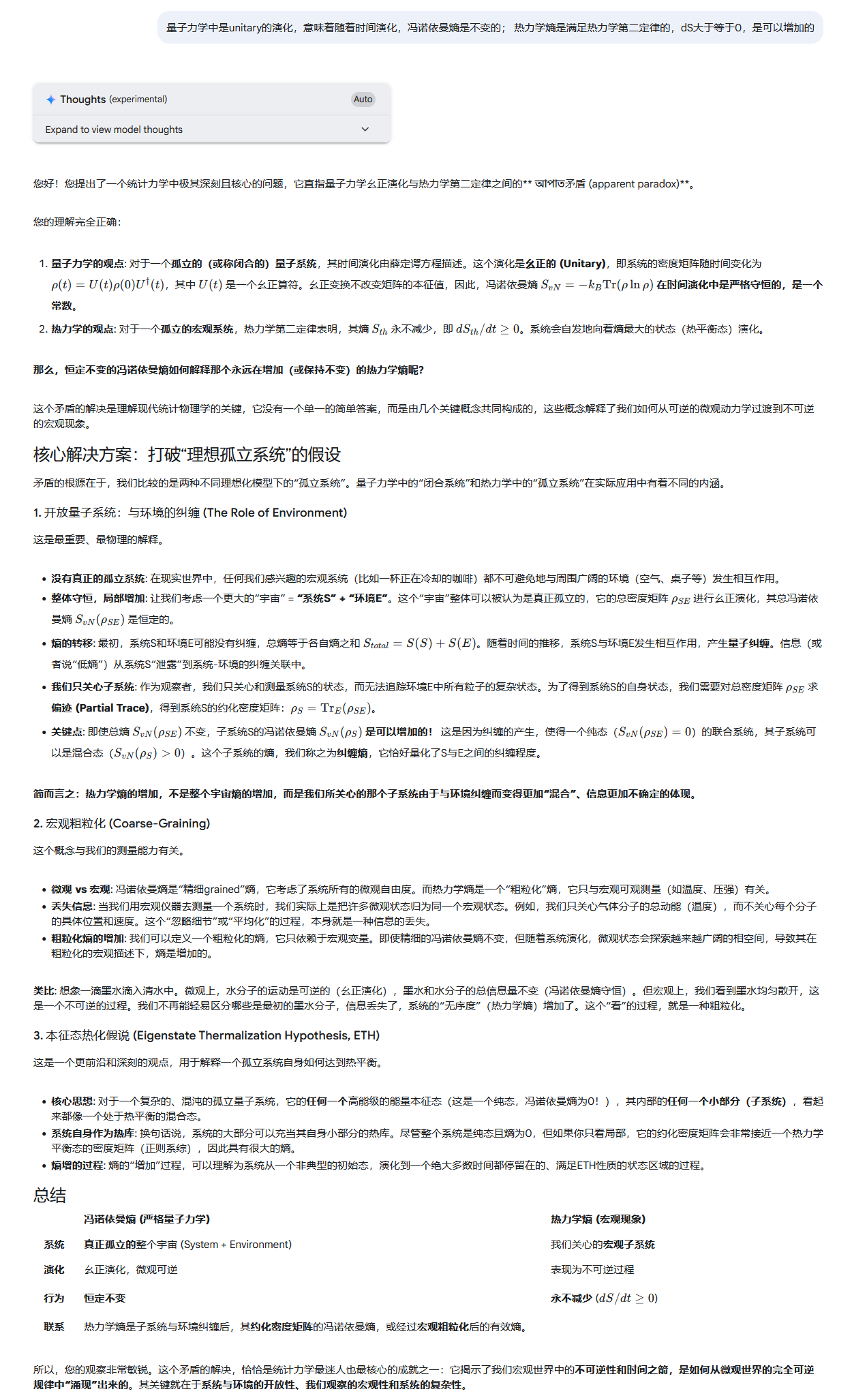 以下は、量子力学における可逆性と熱力学における不可逆性の間の矛盾を解決するための、物理学的な解釈をまとめたものです。この問題は、統計物理学の核心に関わるものであり、特に**開放系(開放量子系)や粗視化(Coarse-Graining)**の概念が重要です。