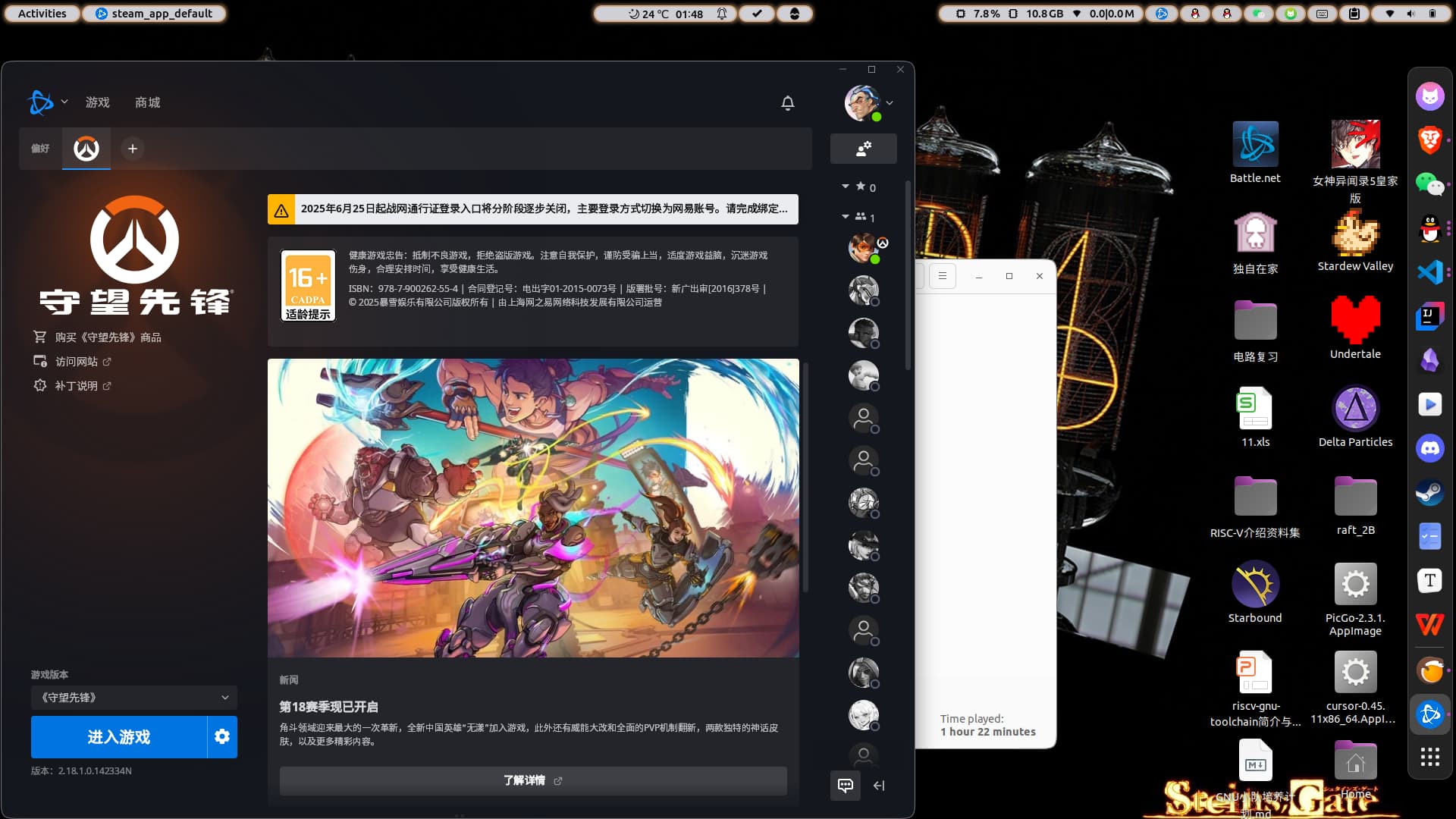 特地浪费了一晚上想办法把 ow 在 linux 上跑起来了,可能是着色器编译的问题,只有四十帧,而且随时有 out of memory 的风险,但是也能解解馋了。