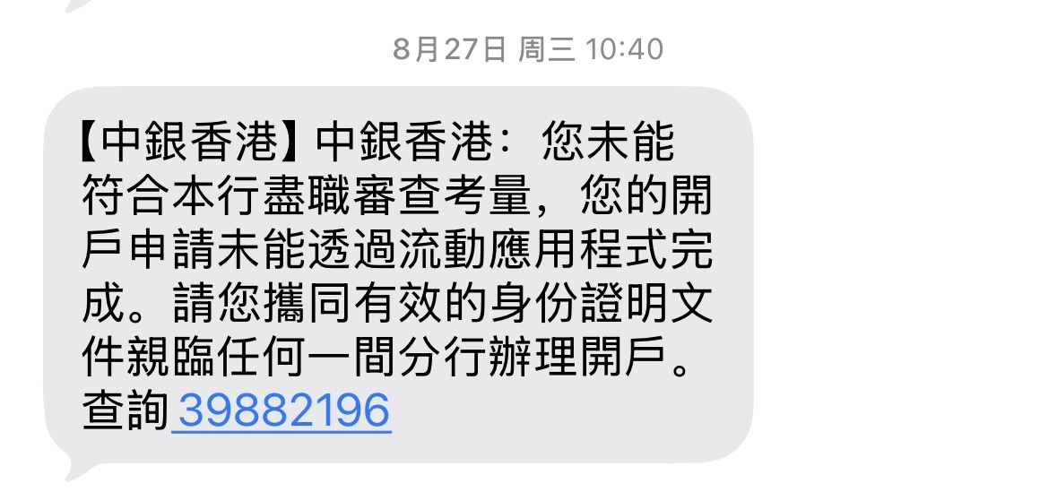 BOCHK 是线上开户,提交完提示需要审查,过了几天发短信说被拒的那种情况?