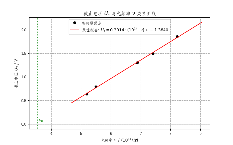 # plt.title(r"截止电压 $U_s$ 与光频率 $\nu$ 关系图线") # 文字列はコード内のため翻訳しません