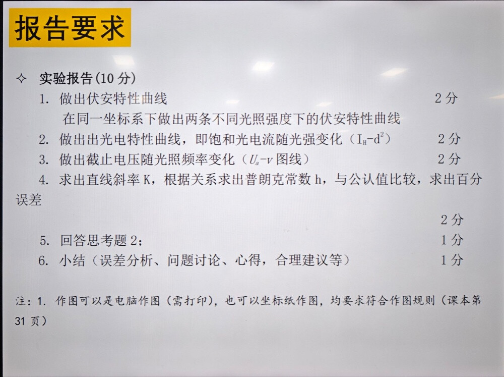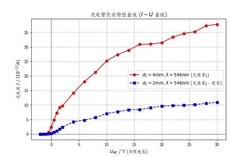 # 結果分析: I-U 曲線は教材図 3-3 と類似した形状で、光強度が大きいほど飽和電流が大きくなることを示すべきです ($I_{H1} > I_{H2}$)