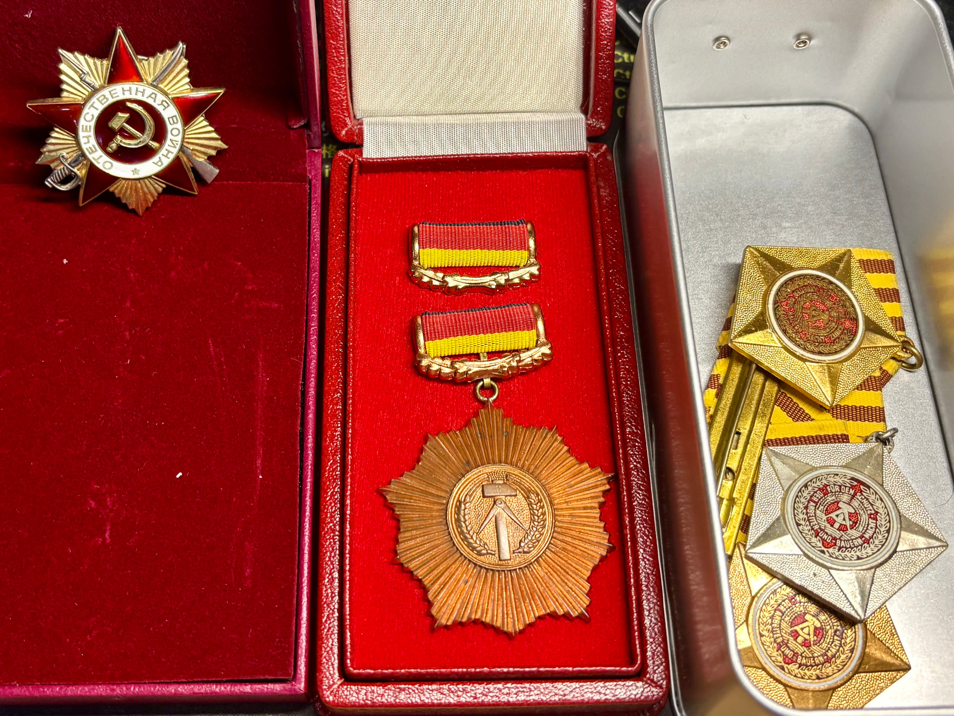 - 银级劳动红旗勋章(背面略光滑,应为铸造件,据此推测为 1975 年之后版本;上挂颜色浅,不像是因为褪色或掉色,猜测是原本就不是理应的红,据此猜测是 1978 年前的版本)