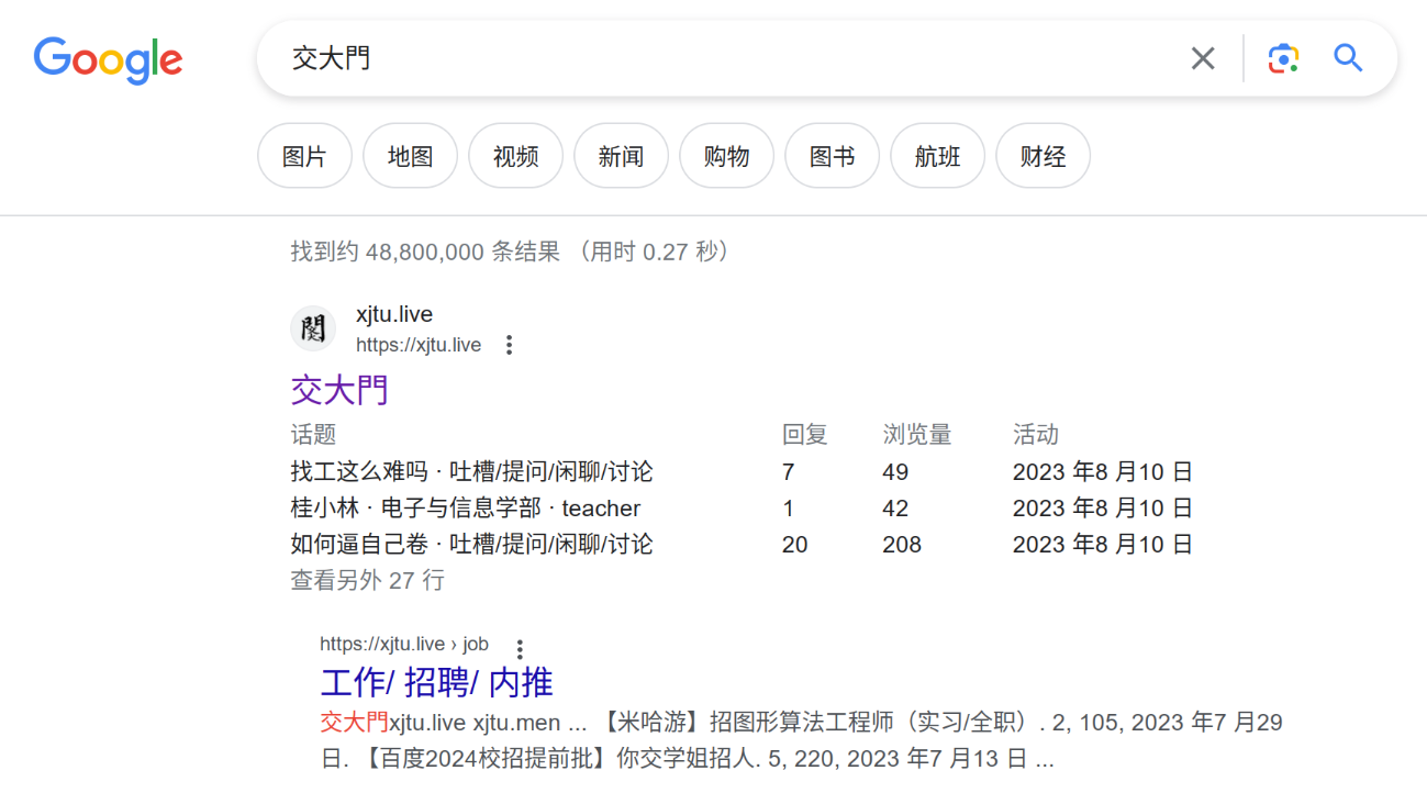使用 Google 搜索“交大門”,结果排在第一个;搜索“交大门”,结果也排在第一页。