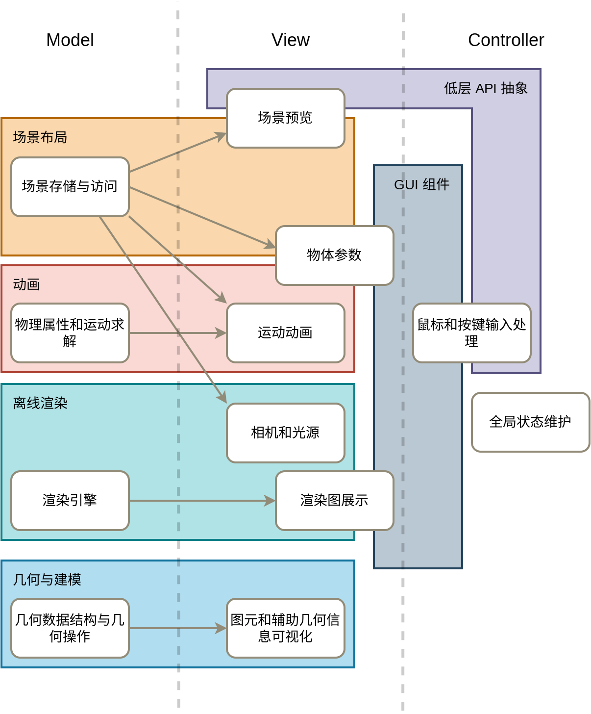 考虑场景预览、渲染、动画、建模等过程,用箭头标出模型层与视图层间的数据流向,可以看到场景存储是很多视图模块的数据源,这正是多个模式共用场景数据的结果。