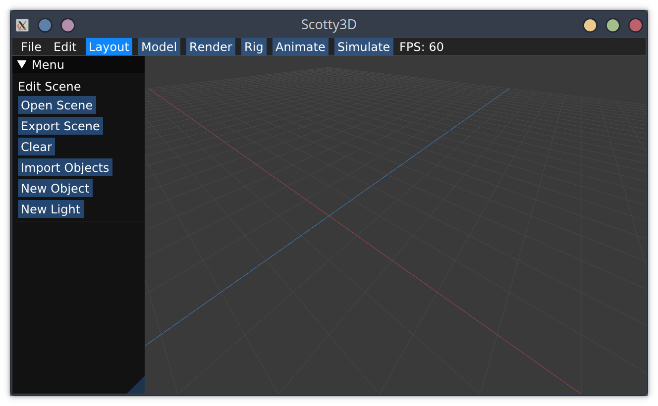 Scotty3D 和 Blender 共有的界面设计思路是“模式切换”:通过顶栏上模式选项卡可以改变当前的操作模式,不同的操作模式对应不同的功能,但共享同一份三维数据(场景数据)。对于一个全功能的设计软件来说,这样有利于将不同功能的 UI 元素聚集在一起,至少我是想不出更好的解决方案了。