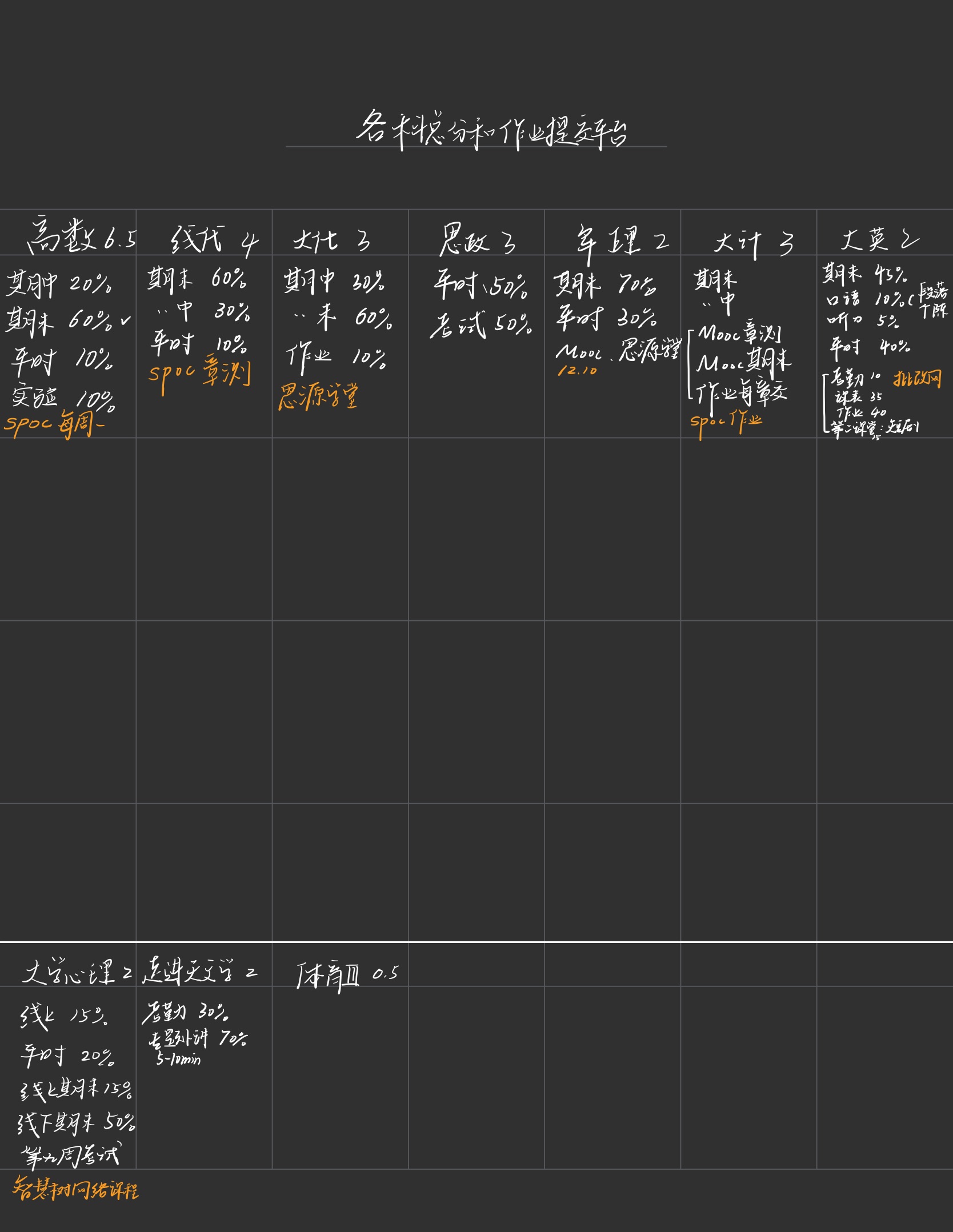 分科目把老师课程要求,课程作业,ddl 写到一张纸上,这样一目了然了