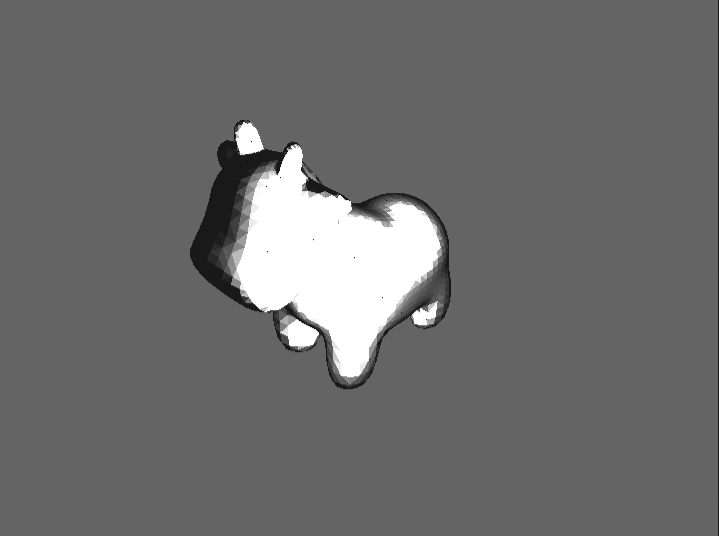 同学,首先是你的点光源应该放在了牛的左侧较近的地方 (如果没有的话,就是坐标变换出了问题)。其次是你的 fragement shader 应该没有使用 phong shading,所以出现了每个三角形面片内部都是完全相同颜色的情况