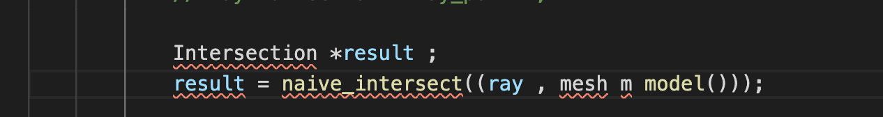 • 三个实参应当依次是 Ray, GL::Mesh, Eigen::Matrix4f 类型,并且依次用逗号隔开。截图中传参时多套了一层括号已经违反 C++ 语法规则了,参数个数也不对。我猜你是想调用 m->model() 来获取某个物体的 Model 矩阵,但不管怎么说你这个用空格分割的写法都不可能得到你想要的东西。