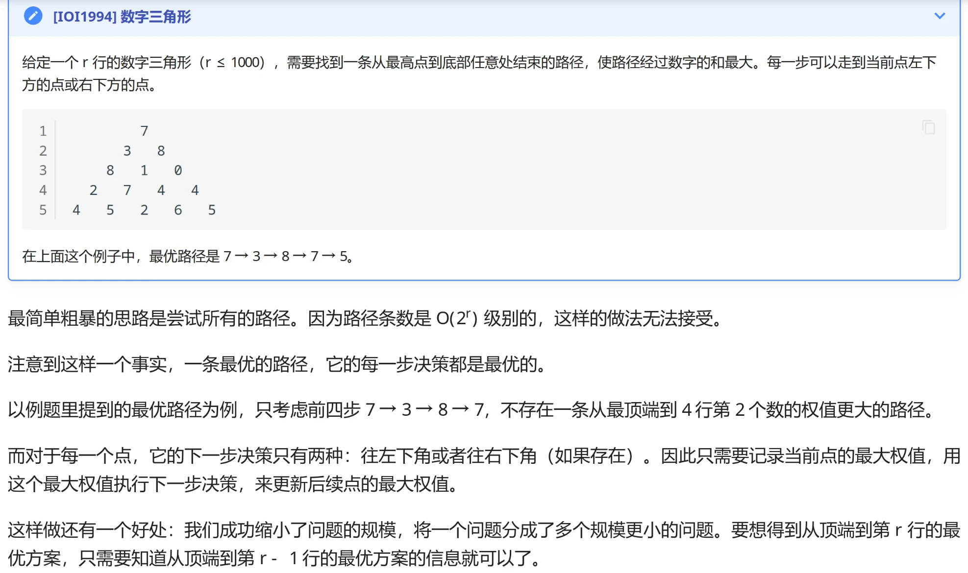 这个和 graph 中的最短路径一样。假如说从第 1 行的 7 到第 4 行的 7 的 7-3-8-7 不是最优路径,就说明从第 1 行的 7 到第 4 行的 7 有另一条路,其数字加起来是比 7-3-8-7 更大的。如果存在这条路,那么说明 7-3-8-7-5 就不是最优的,与假设前提矛盾。