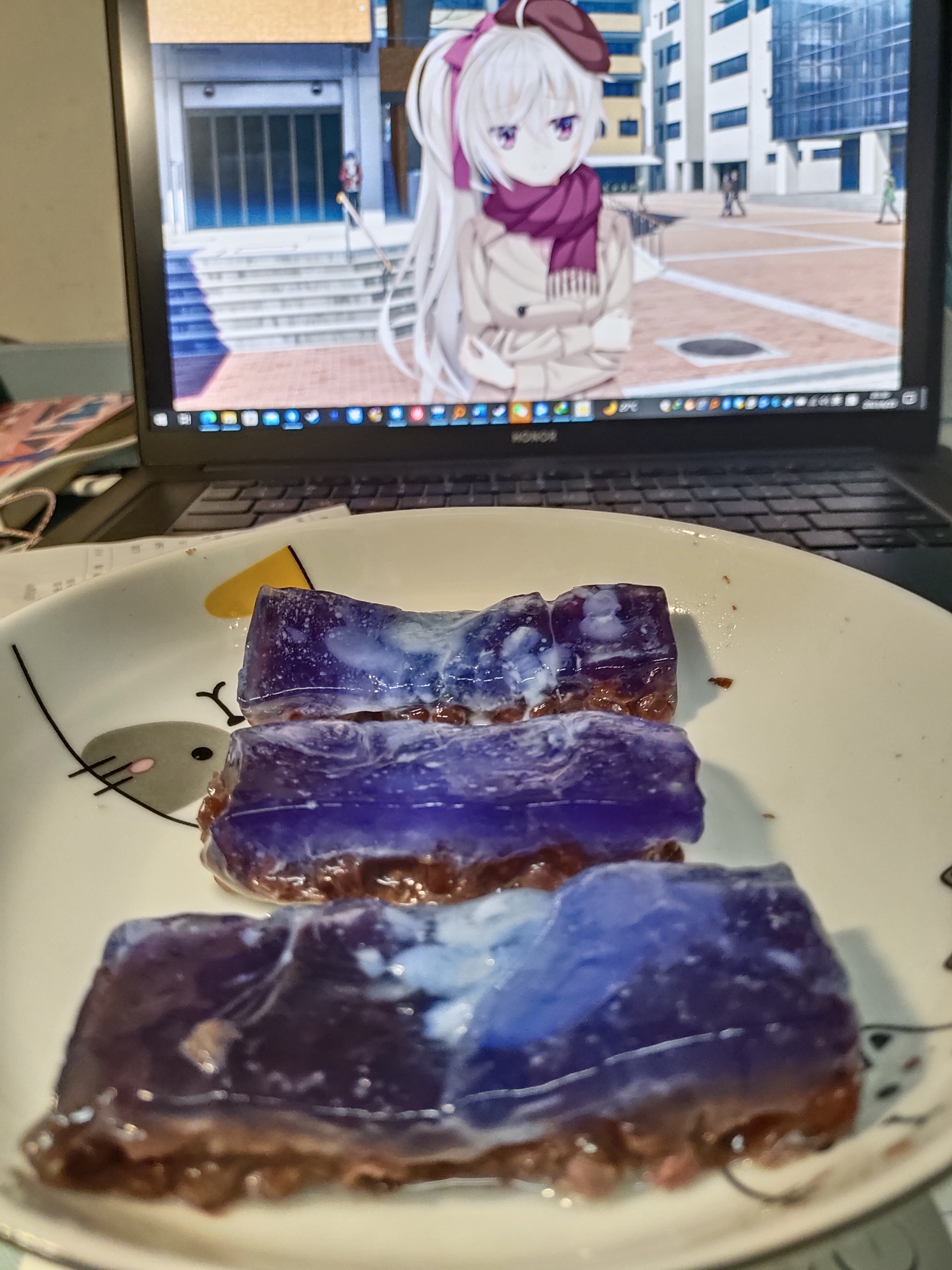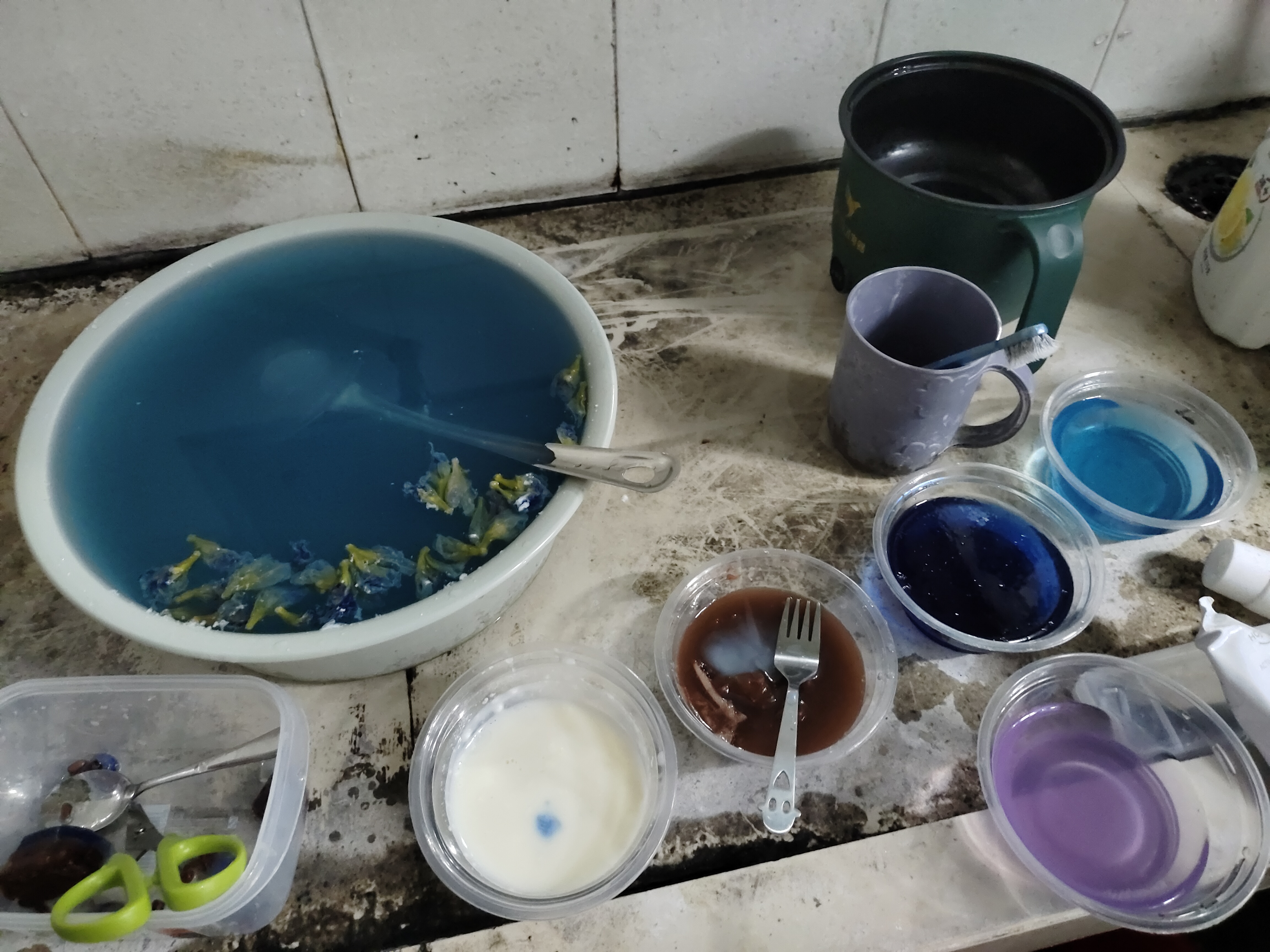 在宿舍试着做星空羊羹,材料大概是蝶豆花、寒天粉、红豆,结果很显然是失败了