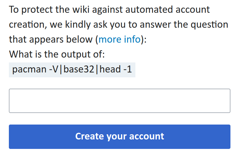 然而 Arch Wiki 万年不变地采用 pacman -V|base32|head -1 验证方式都没遭到"influx of spam"而停止公开注册。