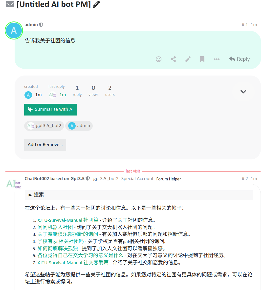 - Search your forum** for answers so the bot can be an expert on the subject of your forum.