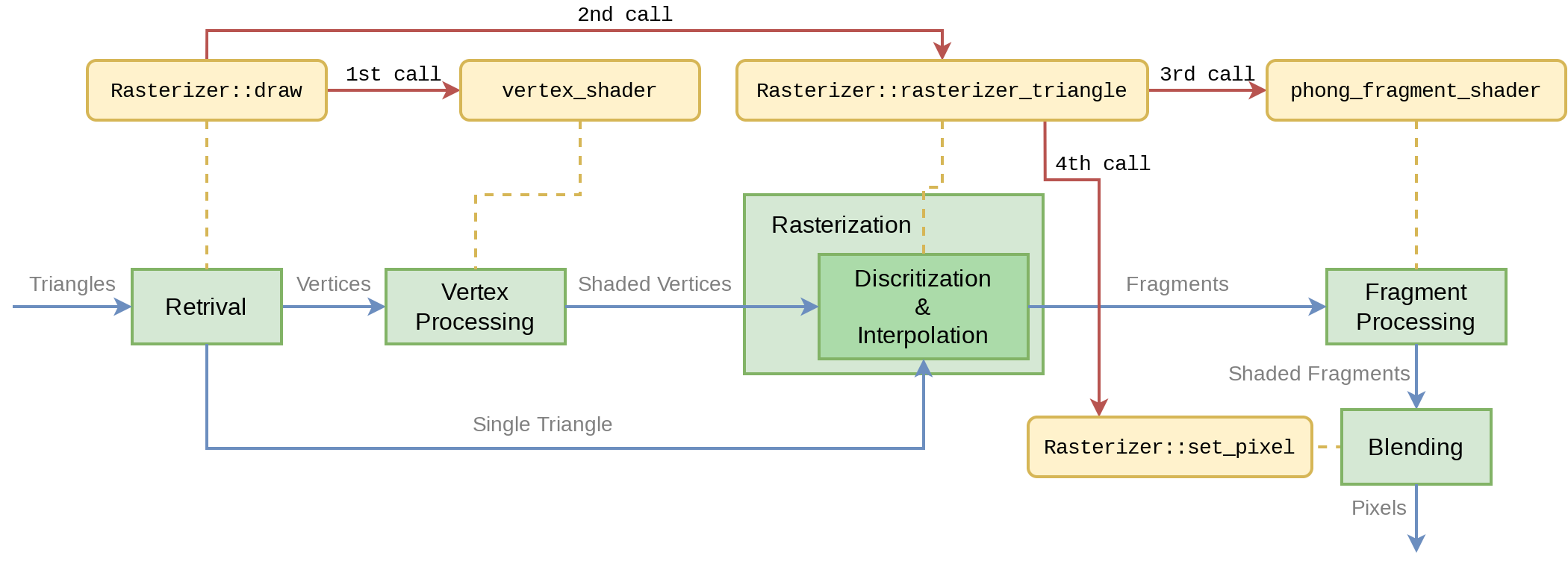 上图中蓝色箭头表示数据流动方向,红色箭头表示函数调用关系,可以看到渲染的核心逻辑都集中在 Rasterizer 内部。但为什么渲染器还要调用 Rasterizer 才能完成渲染呢?这是沿用 GAMES 101 实验框架设计的结果,尽管我不太能理解这样做的意义何在——相反,我甚至觉得这样的设计并不是很好,至少当前就体现出了两个问题: