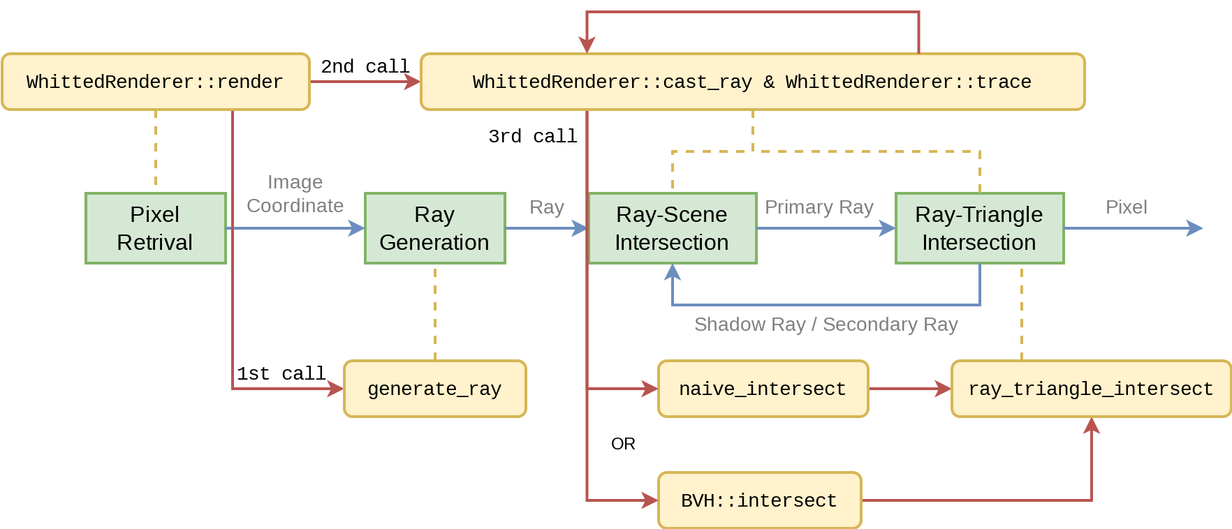 图中代表函数的黄色框分成上下两半,上半部分是 WhittedRenderer 自身的方法,下半部分则是 utils 中的工具函数。