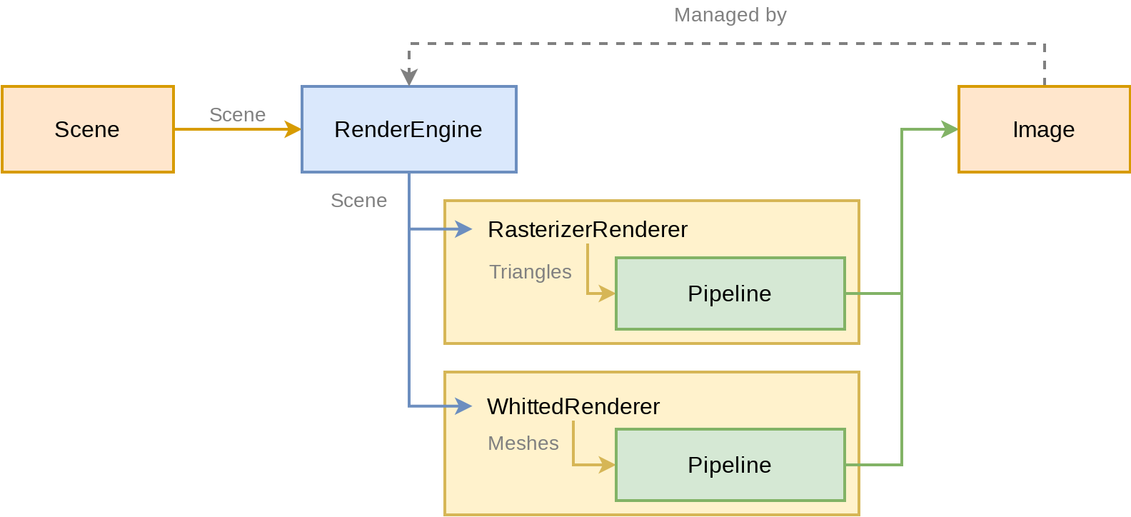 由于 Dandelion 管理场景对象的部分与渲染模块是分离的,渲染器按照约定的层次遍历场景即可获得渲染所需的数据,不必关心读取和解析文件的问题;不同渲染器之间可以共用的配置则存储于 RenderEngine 中,在调用渲染器渲染时传入。